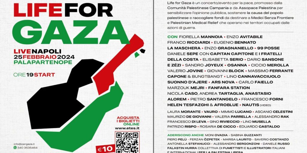 Il 25 febbraio al Palapartenope “Life for Gaza” è un evento per aiutare Medici senza Frontiere impegnata nei fronti di guerra a Gaza e promosso dalla Comunità Palestinese Campania, Assopace Palestina e Suleiman Mohammad Omar. “Life for Gaza” vuole sensibilizzare l’opinione pubblica, sostenere la causa del popolo palestinese e raccogliere fondi da destinare a Medici Senza Frontiere e Palestinian Medical Relief che operano nei territori occupati dalle azioni di guerra.