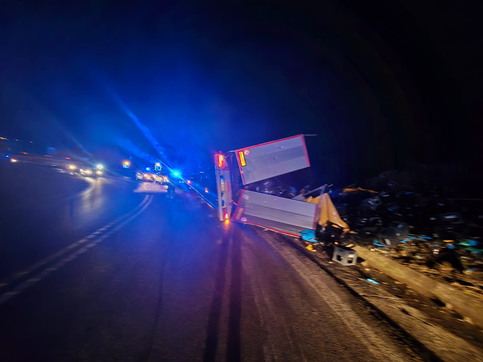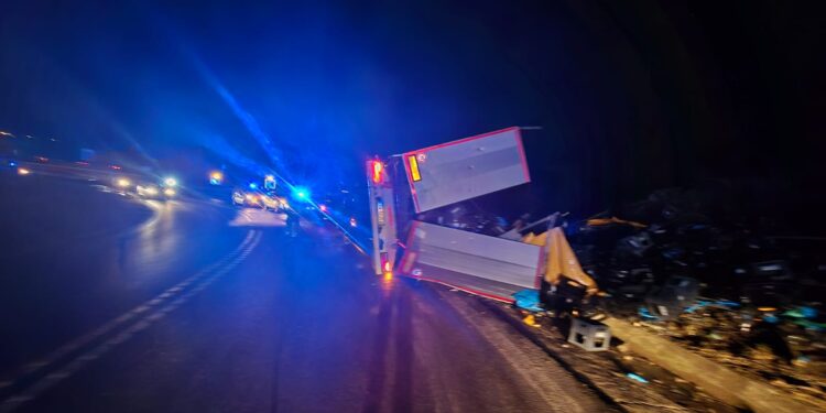 Autoarticolato carico di bottiglie di acqua si ribalta a Contursi