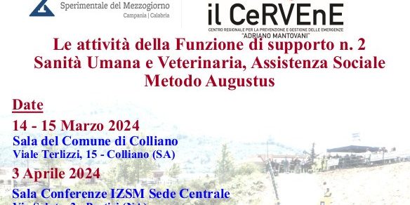 Saranno 80 i corsisti che seguiranno per i primi due giorni a Colliano, la sessione iniziale del corso “Le attività della Funzione di supporto n. 2 Sanità Umana e Veterinaria, Assistenza Sociale Metodo Augustus”. Il corso è inserito, su proposta del Cervene, nel Piano Formativo regionale 2024 in materia di sicurezza e sanità pubblica veterinaria e organizzato dall’Istituto Zooprofilattico Sperimentale del Mezzogiorno.