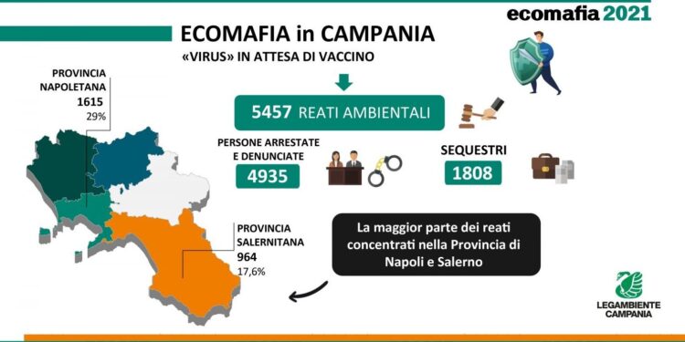 Non si arresta e né conosce crisi il fenomeno delle ecomafie. Negli ultimi cinque anni in Campania sono stati registrati 23.037 reati contro l’ambiente, con 20.543 persone denunciate, 183 persone arrestate e 7.888 sequestri effettuati. La maggior parte dei reati si concentra nelle province di Napoli e Salerno, con il 32% dei reati contro l’ambiente (pari a 7.399) concentrati nell’area metropolitana napoletana e il 18% (pari a 4.227) nella provincia salernitana. Circa 80 clan attivi in diverse filiere, tra cui il ciclo del cemento, dei rifiuti, traffici di animali e sfruttamento delle energie rinnovabili, si sono spartiti la torta insieme ad imprenditori, funzionari e amministratori pubblici collusi, come riportato nel Rapporto Ecomafia 2023.