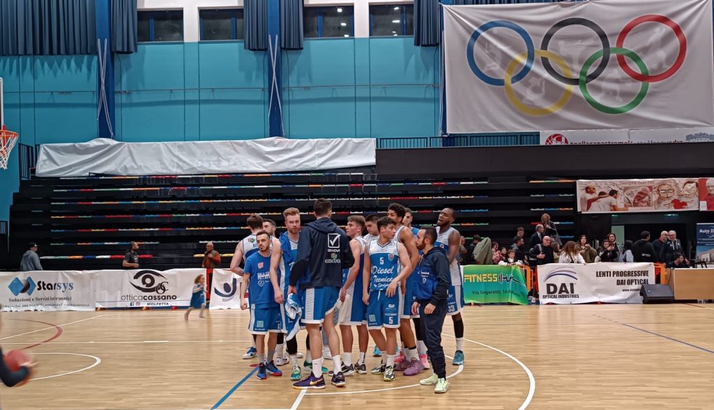 Esce sconfitta dal Palapoli di Molfetta la Diesel Tecnica con il risultato di 92-73. Prestazione abbondantemente sufficiente nei primi due periodi di gara da parte dei blue boys che inseguono e rispondono colpo su colpo agli attacchi di Molfetta che prova a scappare via. All’intervallo, le due squadre tornano negli spogliatoi con il match in sostanziale equilibrio, 43-38 per i padroni di casa indica il tabellino. Alla ripresa di gioco sono nuovamente i pugliesi a partire meglio, una tripla di #23 Aramburu costringe Patrizio al time out e Molfetta vola a +9. Nella terza frazione di gara sbandano per qualche attimo gli uomini di Patrizio toccando il -16 ma sono bravi poi a risalire subito la corrente chiudendo il quarto sul -8. Nell’ultimo periodo le provano tutte i blue boys per rientrare in partita ma Molfetta caccia gli artigli e distrugge i sogni di rimonta biancoazzurra. Resta, quindi, appaiata al vertice la Diesel Tecnica con 12 punti in classifica e 4 punti dalla vetta; nella prossima domenica i blue boys faranno vista alla Power Basket Salerno occasione più che perfetta per trovare il riscatto immediato.