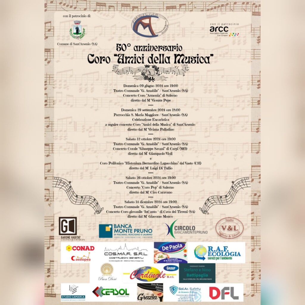 Il concerto del 9 giugno sarà un’occasione unica per celebrare insieme questa importante ricorrenza del coro “Amici della Musica” di Sant’Arsenio e per gustare la bellezza delle voci del Coro Armonia diretto dal Maestro Vicente Pepe.