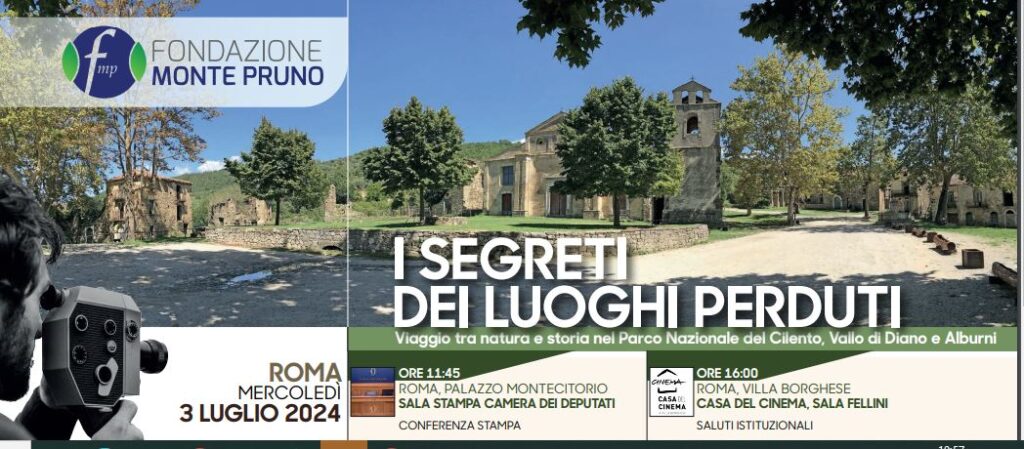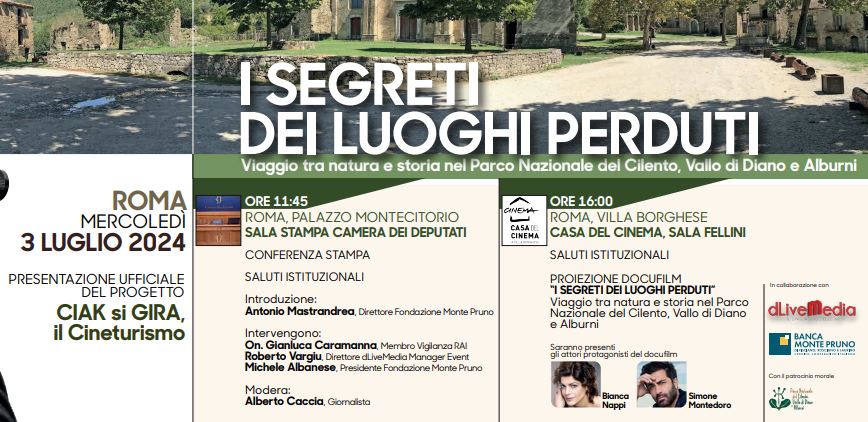 La presentazione del docufilm “I segreti dei luoghi perduti- Viaggio tra natura e storia nel Parco Nazionale del Cilento, Vallo di Diano e Alburni” si terrà in mattinata, alle ore 11.45, a Palazzo Montecitorio, presso la sala stampa della Camera dei Deputati. All’evento saranno presenti, tra gli altri, anche Antonio Mastrandrea, direttore Fondazione Monte Pruno, e Michele Albanese, Presidente Fondazione Monte Pruno. Nel pomeriggio a Villa Borghese, nella Sala Fellini della Casa del Cinema, si terrà la proiezione del docufilm alla presenza degli attori protagonisti, Bianca Nappi e Simone Montedoro.