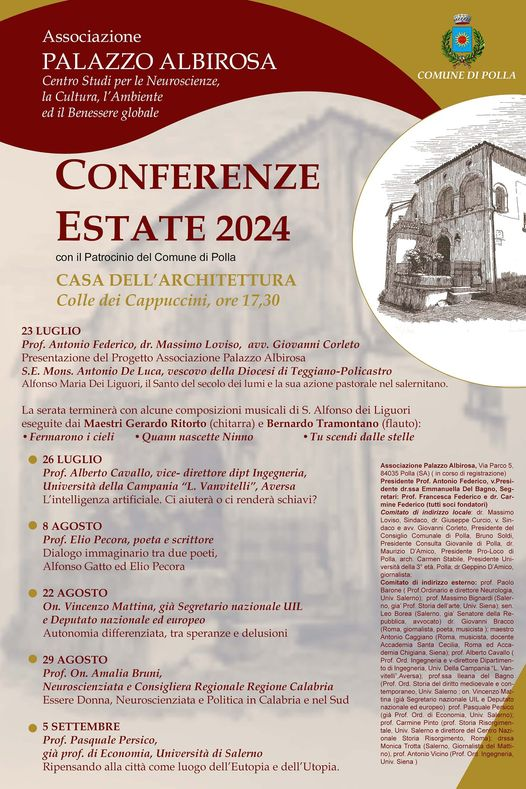 L’attività del Centro studi si svilupperà attraverso conferenze divulgative, manifestazioni scientifiche, progetti di ricerca, redazione di documenti su tematiche emergenti e molto altro. La prima attività sarà costituita da un ciclo di conferenze, delle quali due sono legate a personaggi che sono stati ospiti nel passato del Palazzo Albirosa, sant’Alfonso dei Liguori ed Alfonso Gatto. Le altre conferenze saranno legate a temi di attualità, dall’intelligenza artificiale all’autonomia differenziata e alla promozione dei piccoli centri. Tutte le conferenze, realizzate con il patrocinio del Comune di Polla, si svolgeranno alle ore 17,30 presso la Casa dell’Architettura, al Colle dei Cappuccini e saranno aperte liberamente al pubblico interessato. Il primo appuntamento, durante il quale verrà presentata l’Associazione, è previsto il 23 luglio. Seguirà una conferenza, tenuta da SE il Vescovo di Teggiano, mons. Antonio De Luca, convinto seguace di S. Alfonso, accompagnata dall’esecuzione di tre brani musicali composti dal santo ad opera dei maestri G. Ritorto ( chitarra) e B. Tramontano (flauto).