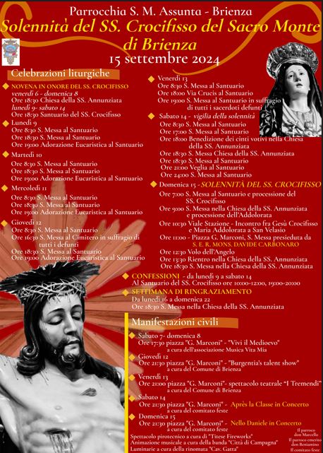 Domenica 15 settembre si rinnovano, nella tradizione, i solenni festeggiamenti in onore del SS. Crocifisso Miracoloso del Sacro Monte di Brienza. Le celebrazioni che cadono come ogni anno, la terza domenica di settembre, giorno del rientro solenne nella chiesa madre di Brienza, della statua del SS. Crocifisso, si confermano un vero e proprio dono per le centinaia di pellegrini che giungono da ogni angolo della Basilicata.