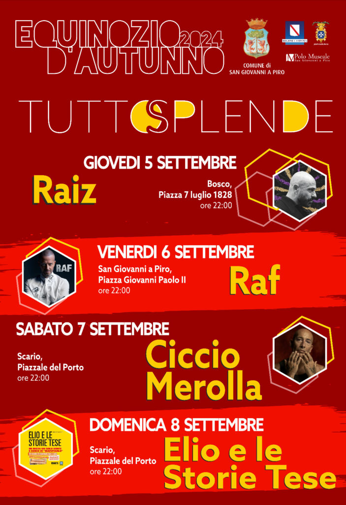 Un Calendario fitto di eventi con una line up tutta da ascoltare. Si comincia il 5 Settembre con Raiz a Bosco, per poi continuare il 6 con il concerto di Raf a San Giovanni a Piro e due appuntamenti a Scario sabato 7 e domenica 8 insieme a Ciccio Merolla ed Elio e le storie tese.
