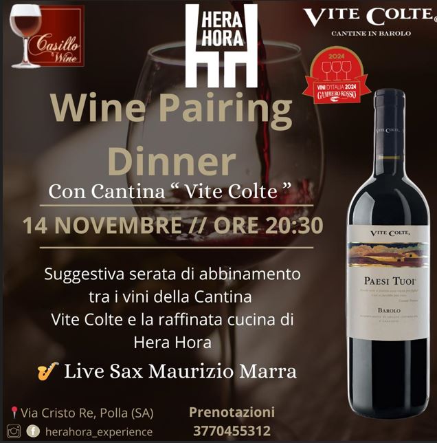 A Hera Hora, locale di tendenza situato in via Cristo Re a Polla, si terrà la “Wine Pairing Dinner”, una cena-evento ideata dal ristorante in collaborazione con la Cantina “Vite Colte”. Si tratta di una suggestiva serata di abbinamenti tra i vini della cantina e la raffinata cucina del locale. Il tutto accompagnato da magnifica musica, dal Live Sax di Maurizio Marra che creerà la giusta atmosfera.