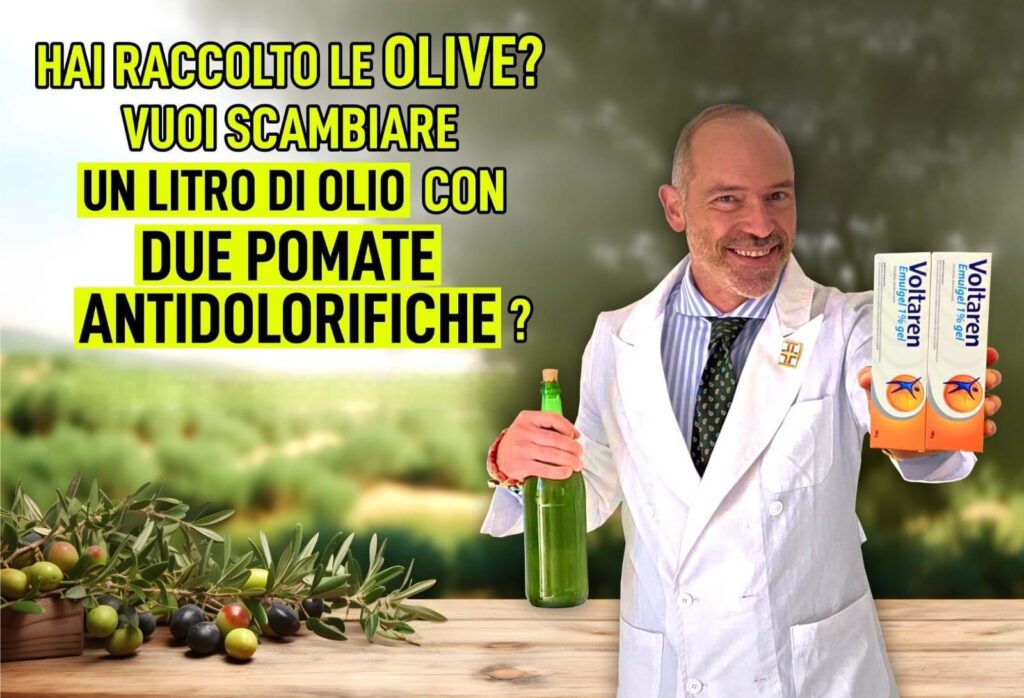 Si tratta, ritornando alle origini del baratto, di uno scambio senza l’intermediazione della moneta e, perché no, approfittando per scambiare qualche chiacchiera sulla produzione annuale: in farmacia si porta un litro di olio ottenuto dalla raccolta e si ricevono due confezioni di pomate antidolorifiche. Un modo diverso e divertente per ringraziare chi, con sacrificio e amore, mantiene viva una tradizione antica e sacra, il cui frutto è uno degli alimenti principi della nostra tavola erroneamente considerato responsabile dell’aumento di peso.