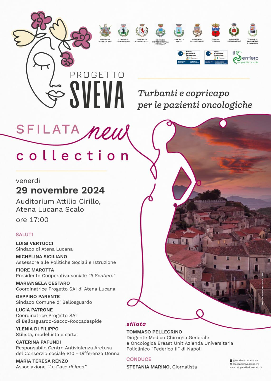 È attesa per il prossimo pomeriggio di Venerdi 29 Dicembre, nell’auditorium Attilio Cirillo di Atena Lucana Scalo, la sfilata della nuova collezione di turbanti e copricapi per le pazienti oncologiche, realizzati dal laboratorio tessile del “Progetto Sveva”, il laboratorio di sartoria a cura delle donne migranti coadiuvate dalla Cooperativa sociale “Il Sentiero”.