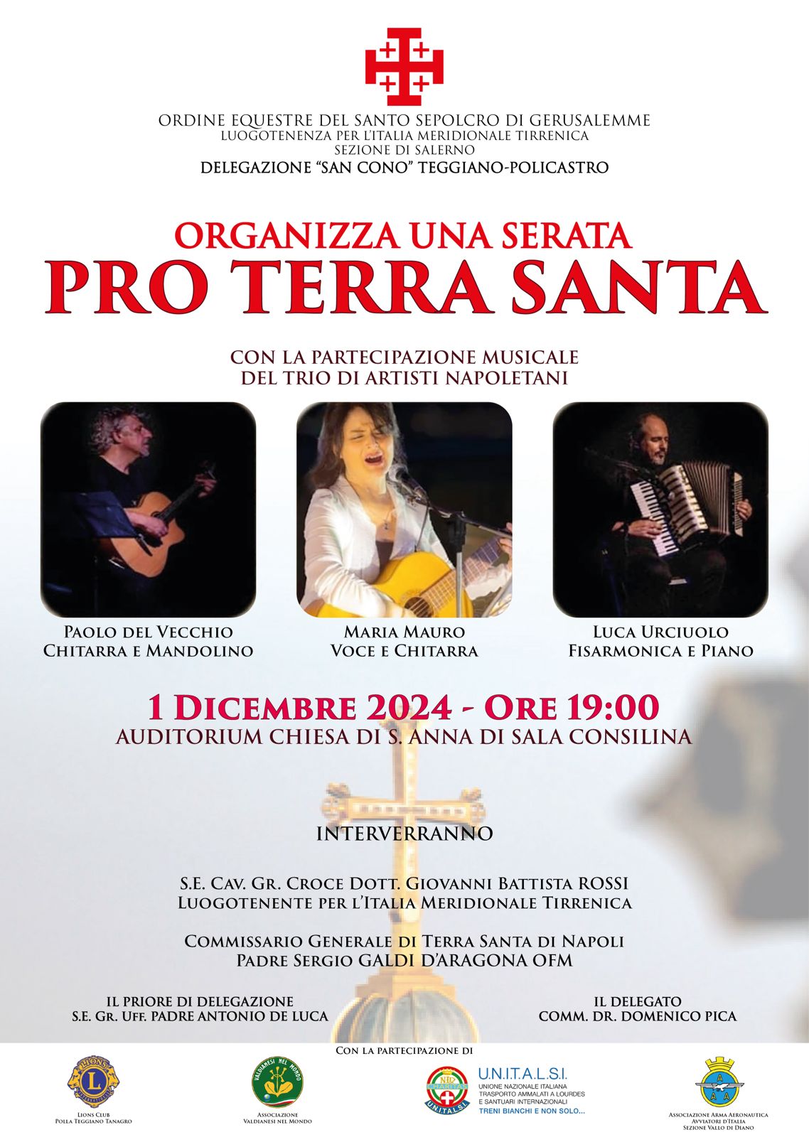 La Delegazione “San Cono” Teggiano-Policastro, dell’Ordine Equestre del Santo Sepolcro di Gerusalemme, ha organizzato una serata pro Terra Santa presso l’Auditorium della chiesa di S. Anna di Sala Consilina, prevista per il 1° dicembre 2024, dalle ore 19:00. Ad accompagnare l’appuntamento di domenica prossima, ci sarà un trio di artisti napoletani: Paolo Del Vecchio, con la chitarra e il mandolino; Maria Mauro, con la sua voce e la chitarra; Luca Urciuolo, fisarmonica e piano. Durante la serata, poi, interverranno il S. E. Cav. Gr. Croce Dott. Giovanni Battista Rossi, i Commissario Generale di Terra Santa di Napoli Padre Sergio Galdi D’Aragona OFM, il Priore di Delegazione S. E. Gr. Uff. Padre Antonio De Luca ed il Delegato Comm. Dr. Domenico Pica.