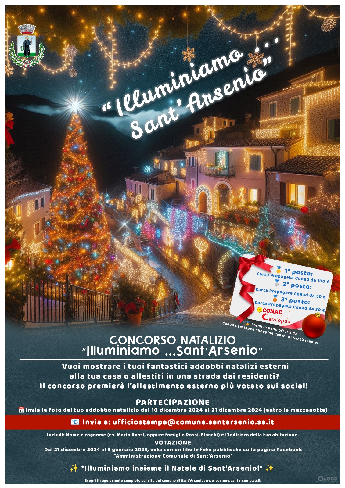 Si avvicina il Natale e con esso si moltiplicano le iniziative organizzate dai comuni per far vivere ai propri concittadini questa festività nel modo più gioioso possibile. Il Comune di Sant’Arsenio, ad esempio, ha deciso di organizzare il concorso “Illuminiamo…Sant’Arsenio” in cui ognuno potrà mostrare i propri addobbi natalizi, allestiti all’esterno delle proprie case o in strada dai residenti del luogo.