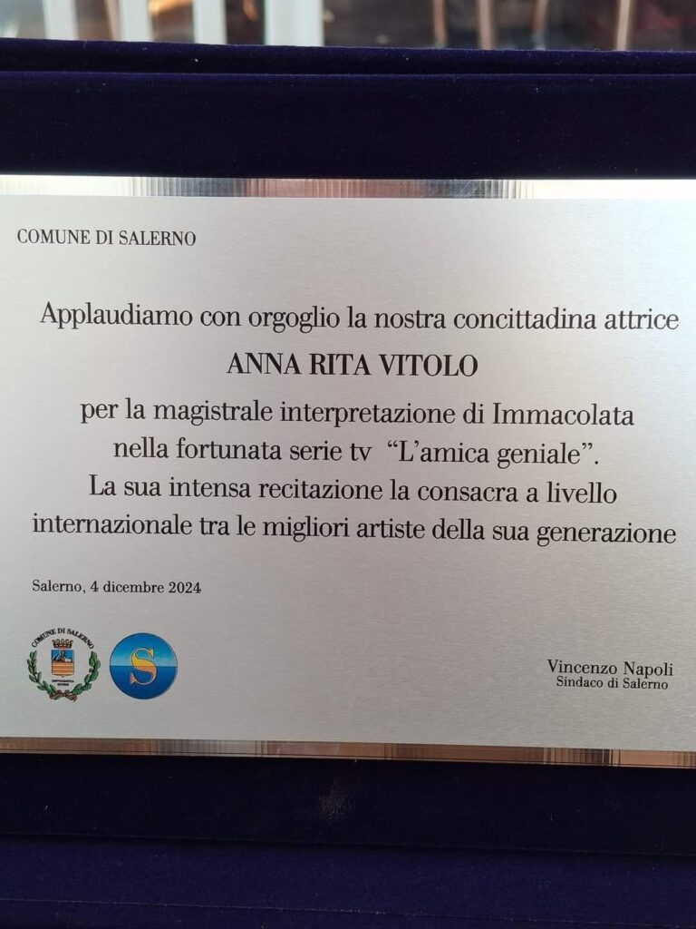 Il sindaco di Salerno Vincenzo Napoli ha cosi commentato: “Bravissima Anna Rita Vitolo. La nostra concittadina è stata tra le interpreti più importanti de “L’amica geniale”. Nella serie tv, tratta dai romanzi di Elena Ferrante, ha interpretato in modo magistrale il personaggio di Immacolata, la madre di Lenù. In ogni scena ha saputo trasmettere ai telespettatori commozione, rabbia, disincanto, orgoglio; una miscela di sentimenti coinvolgenti e complessi che attraversa l’intera vita della protagonista.”