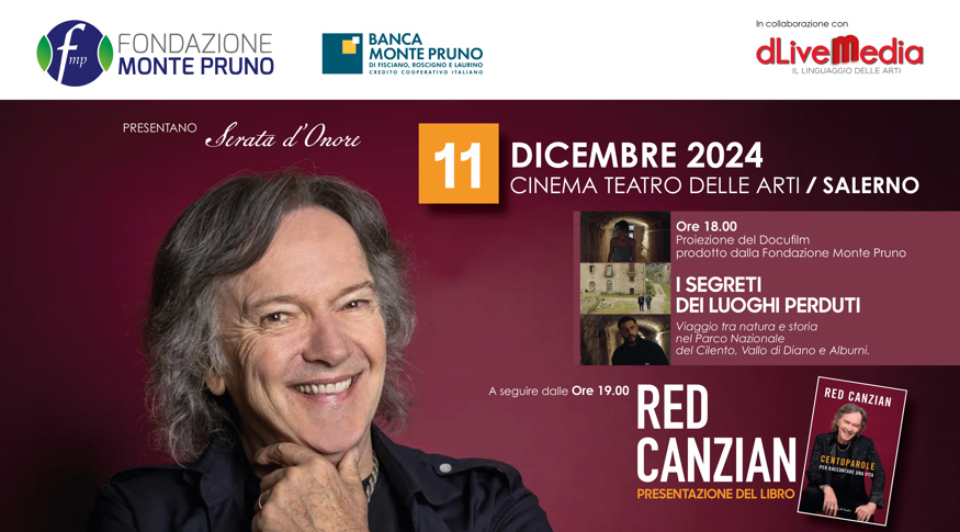 L’evento, che sarà preceduto dai saluti istituzionali di Michele Albanese, Presidente della Fondazione Monte Pruno, Claudio Tortora, patron del Teatro delle Arti e Roberto Vargiu, rappresentante di dLiveMedia, prevede inoltre a partire dalle ore 19.00, la presentazione del libro “Centoparole” di Red Canzian. Attraverso cento parole, lo storico bassista dei Pooh condivide emozioni, ricordi e valori che hanno plasmato la sua vita personale e professionale, intrecciando esperienze vissute sul palco e nella quotidianità. Ogni parola diventa uno spunto per riflettere, sognare e riscoprire il significato del “domani”, in un viaggio profondo che punta a toccare il cuore oltre che la mente del lettore.