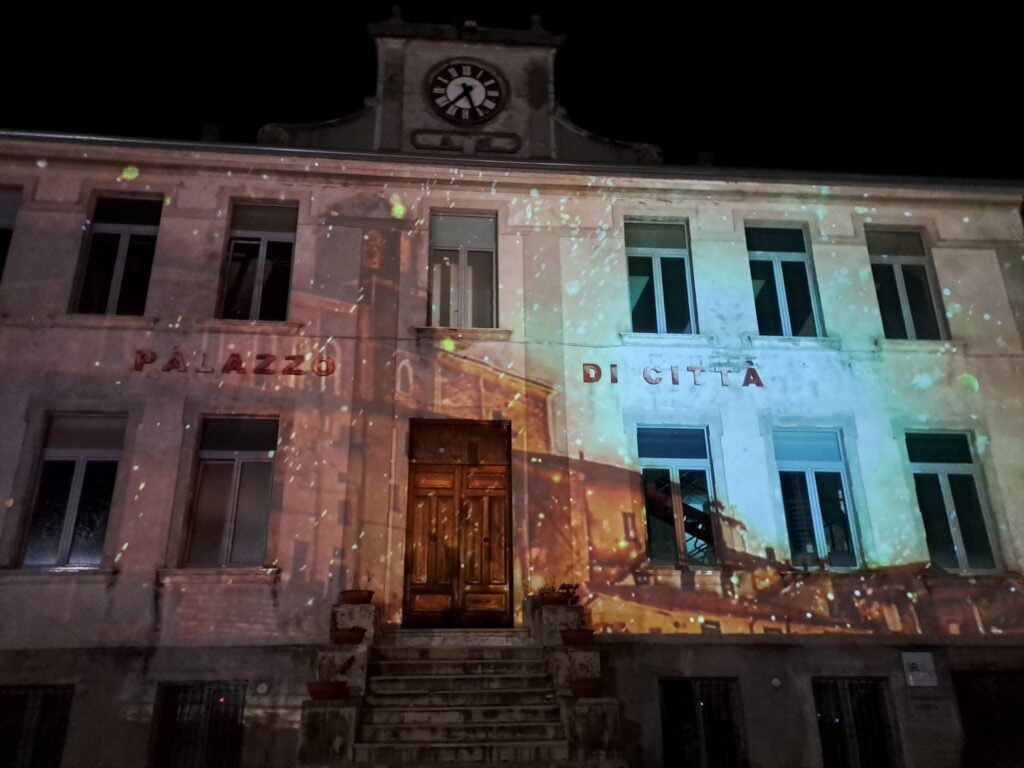 La fiaccolata si poi fermata presso il Palazzo di Città, dove i fan di Mango hanno potuto ammirare lo spettacolo di luci che è stato preparato per ricordare il celebre cantautore.