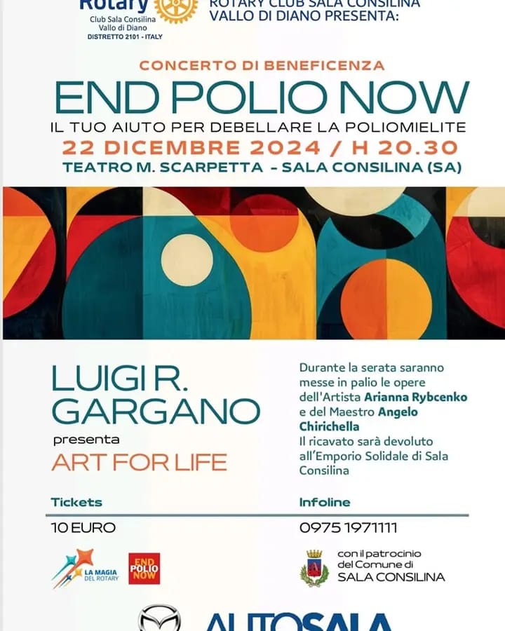 Domenica 22 dicembre, nel Teatro Scarpetta, si è tenuto il concerto di Natale “End Polio Now” organizzato dal Rotary Club Sala Consilina-Vallo di Diano che ha registrato il sold out. La serata di beneficenza, realizzata con il patrocinio del comune di Sala Consilina, aveva lo scopo di raccogliere fondi per la lotta contro la poliomielite nell’ambito del progetto internazionale Polio Plus promosso dal Rotary International. Sul palcoscenico si sono esibiti il noto musicista di origini valdianesi Luigi R. Gargano, che ha presentato il suo concerto “Art for Life”, insieme al batterista Antonio Porpora e alla cantante Karen Vatteroni. L’esibizione è durata circa due ore e ha coinvolto i quasi 500 spettatori dello splendido teatro Scarpetta.