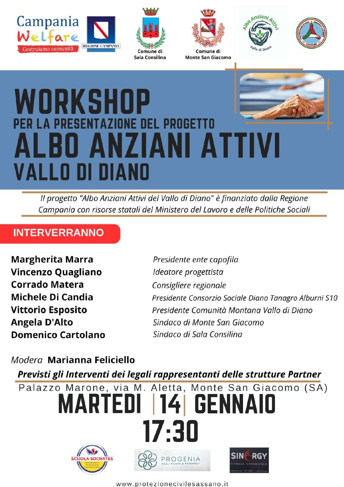 L’O.D.V. Protezione Civile Sassano Gruppo Lucano presenterà domani 14 Gennaio, alle 17:30, a Palazzo Marone sito a Monte San Giacomo, il progetto ” AAA Albo Anziani Attivi”.