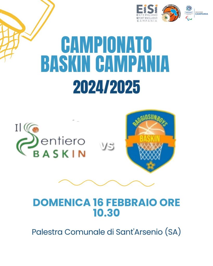 Domani sarà una domenica targata Baskin. Alla Palestra Comunale di Sant’Arsenio, infatti, alle ore 10:30, andrà in scena il match tra i padroni di casa de Il Sentiero Baskin e Raggio SunBoys Baskin. Il Sentiero Baskin arriva al match forte di tre vittorie e una sola sconfitta nella bellissima gara contro Ischia Baskin disputata lo scorso 26 gennaio.