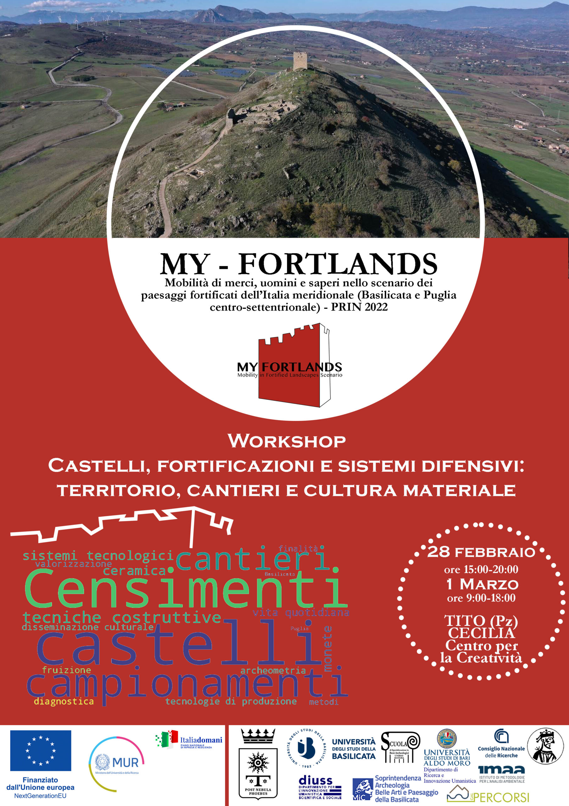 Inizierà venerdì 28 febbraio, alle 15.00, presso il Cecilia, Centro per la creatività di Tito, il workshop “Castelli, fortificazioni e sistemi difensivi: territorio, cantieri e cultura materiale”, nell’ambito del PRIN 2022 MY-FORTLANDS (MobilitY of goods, men and knowledge in the FORTified LANDscape Scenario of southern Italy – Basilicata and north-central Apulia – in the Middle Age), PI Responsabile del Progetto la Professoressa Francesca Sogliani (DIUSS-UNIBAS). Il PRIN (Progetto di ricerca di Rilevante Interesse Nazionale), finanziato con fondi Next Generation EU, è incentrato sulla conoscenza dei paesaggi fortificati che hanno segnato i territori dell’Italia meridionale, con particolare attenzione alla Basilicata e alla Puglia centro settentrionale, fra tarda antichità e Medioevo, come indicatori di trasformazione territoriale ed ecosistema attorno al quale gravitava la mobilità di merci, uomini e saperi.