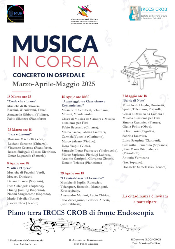 “La musicoterapia, è una disciplina che usa la musica per promuovere il benessere, può aiutare i pazienti ricoverati a ridurre lo stress e favorire la comunicazione, può influenzare le emozioni e i pensieri” ha dichiarato il direttore generale Irccs Crob Massimo De Fino che ha poi ringraziato il Conservatorio ‘Carlo Gesualdo da Venosa’ di Potenza e a tutti i maestri e gli allievi che si esibiranno gratuitamente nell’ospedale.