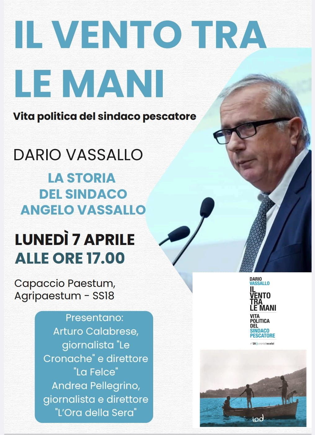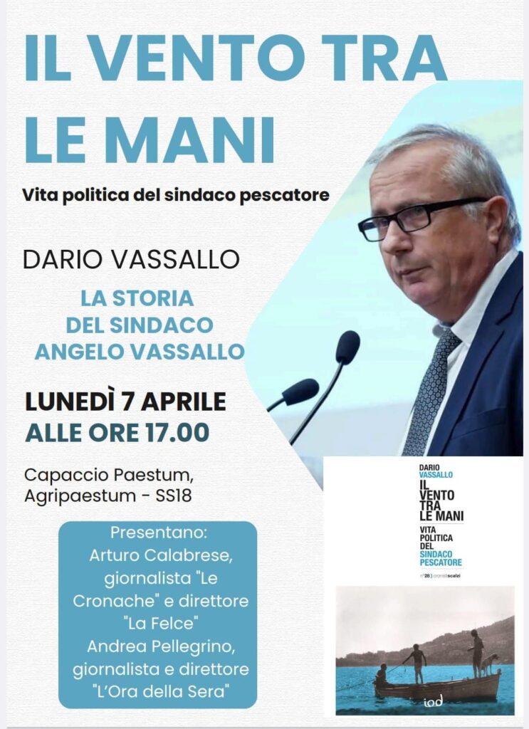 Il prossimo 7 Aprile, alle ore 17:00, presso l’AgriPaestum di Capaccio Paestum, si terrà la presentazione del libro Il vento tra le mani. Vita politica del Sindaco Pescatore, scritto da Dario Vassallo, fratello di Angelo Vassallo. L’evento rappresenterà un’occasione per ricordare il sindaco di Pollica, assassinato il 5 settembre 2010 per il suo impegno in difesa della legalità e dell’ambiente.