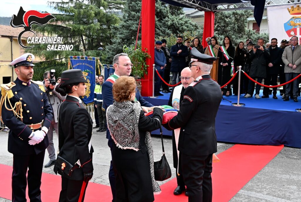 La cerimonia è iniziata con la resa degli onori al Generale di Divisione Canio Giuseppe La Gala, Comandante della Legione Carabinieri “Campania”, accompagnata dalla Fanfara del 10° Reggimento Carabinieri “Campania”, che ha eseguito la marcia d’ordinanza “La Fedelissima”. Il momento è stato seguito da un raccoglimento in memoria dei militari caduti nell’adempimento del loro dovere. Dopo la benedizione delle bandiere da parte di Don Carlo Lamelza, Capo Servizio Assistenza Spirituale del Comando Legione Carabinieri “Campania”, la madrina della cerimonia, Teresa De Vita, nipote dell’eroe, ha consegnato le bandiere al comandante della stazione.