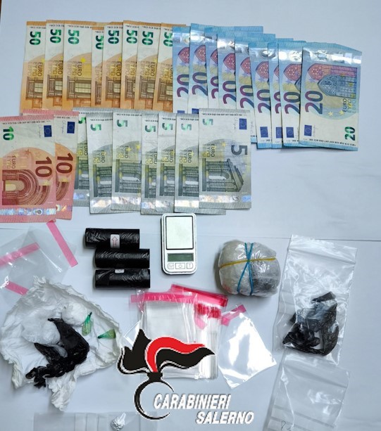 La successiva perquisizione domiciliare ha permesso di rinvenire ulteriori quantità di eroina, hashish e cocaina, un bilancino di precisione, materiale per il confezionamento delle dosi e la somma in contanti di 635 euro, ritenuta verosimilmente provento dell’attività di spaccio.
