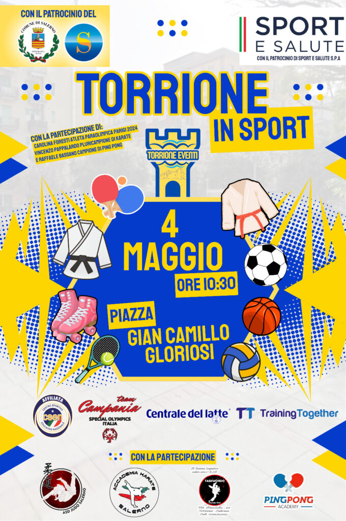 La città di Salerno si dimostra essere particolarmente attenta al benessere fisico dei suoi concittadini, specialmente dei più giovani. L’Associazione Torrione Eventi APS ha infatti organizzato “Torrione in Sport”, un evento totalmente gratuito dedicato alla promozione dell’attività fisica e all’inclusione sportiva. L’appuntamento è per sabato 4 maggio, a partire dalle ore 10.30, in Piazza Gian Camillo Gloriosi a Salerno. Come si legge sulla pagina istituzionale del Comune, “questa giornata nasce con l’obiettivo di sensibilizzare la cittadinanza sull’importanza dello sport come strumento di salute, benessere e partecipazione attiva, senza barriere. Una vera e propria festa all’aria aperta dove adulti, giovani e bambini potranno conoscere da vicino diverse discipline sportive e cimentarsi in attività guidate da istruttori qualificati”.