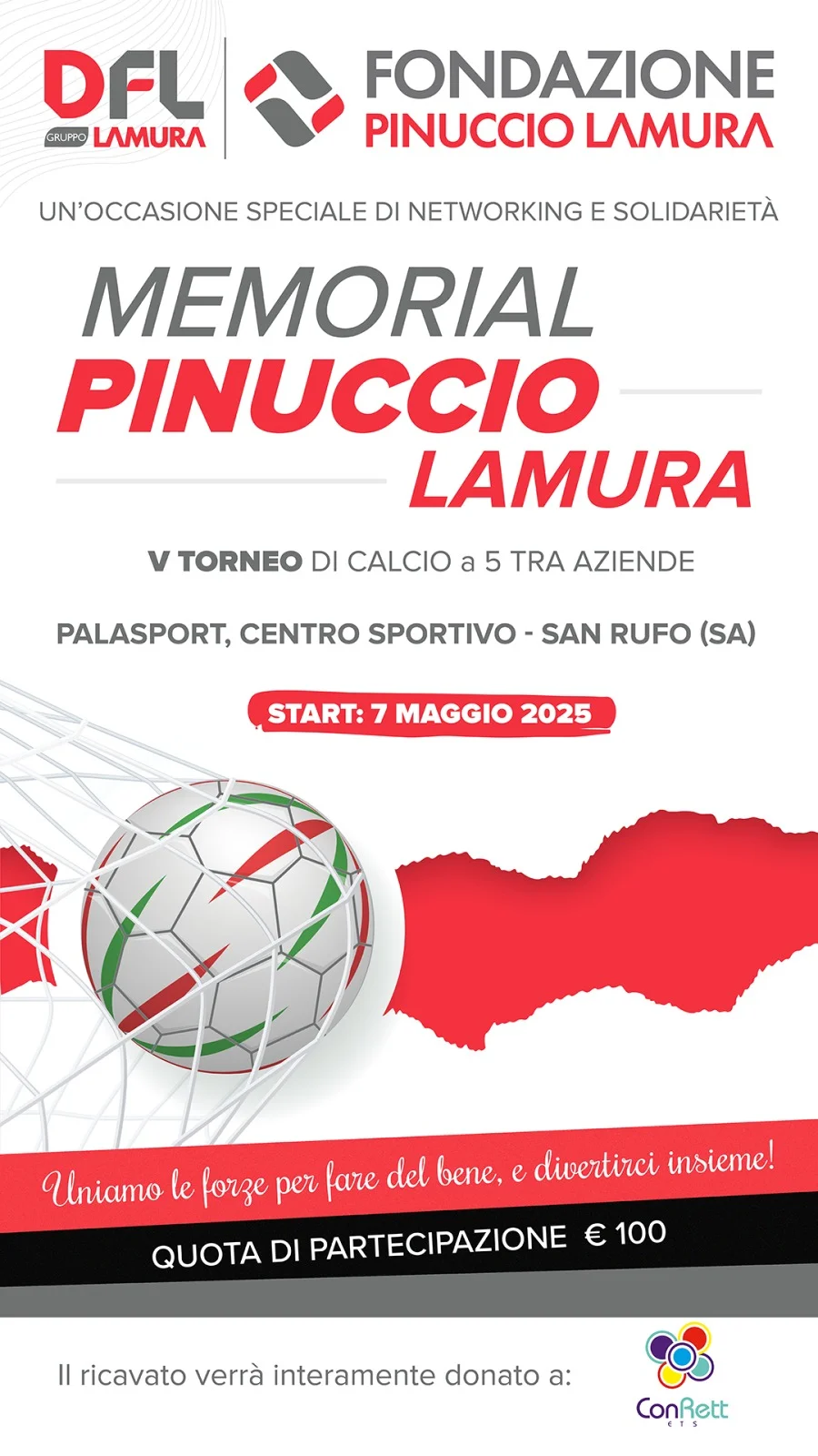 Torna anche quest’anno uno degli appuntamenti più sentiti e partecipati nel territorio del Vallo di Diano: il Memorial Pinuccio Lamura, il torneo aziendale di calcio a 5 che ormai da cinque edizioni celebra la figura carismatica e intraprendente di Pinuccio Lamura, fondatore del DFL – Gruppo Lamura di Sala Consilina . Non solo sport, ma anche un’occasione unica per sottolineare valori come l’amicizia, la collaborazione tra imprese e soprattutto la solidarietà.