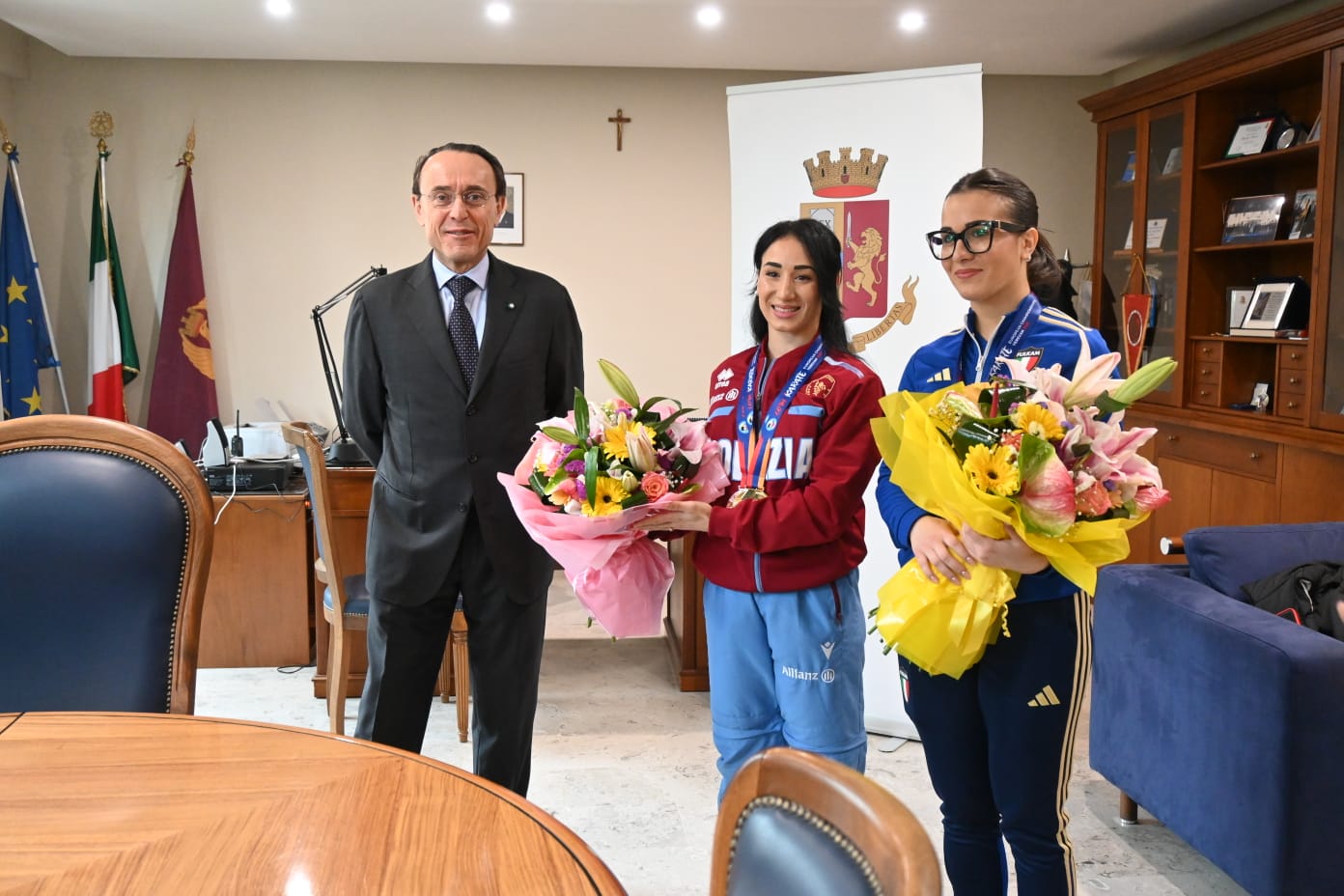 Questa mattina, il Questore di Potenza Giuseppe Ferrari ha accolto in Questura le sorelle Orsola e Terryana D’Onofrio, reduci dai recenti e prestigiosi successi ottenuti ai Campionati Europei di karate, svoltisi in Armenia.  Le due sorelle lucane, originarie di Sant’Arcangelo sono reduci, la prima, dalla vittoria del titolo europeo nel kata individuale ai Campionati Europei di Karate 2025, la seconda, dalla medaglia di bronzo a squadre (peraltro vinta in squadra con la sorella più grande).