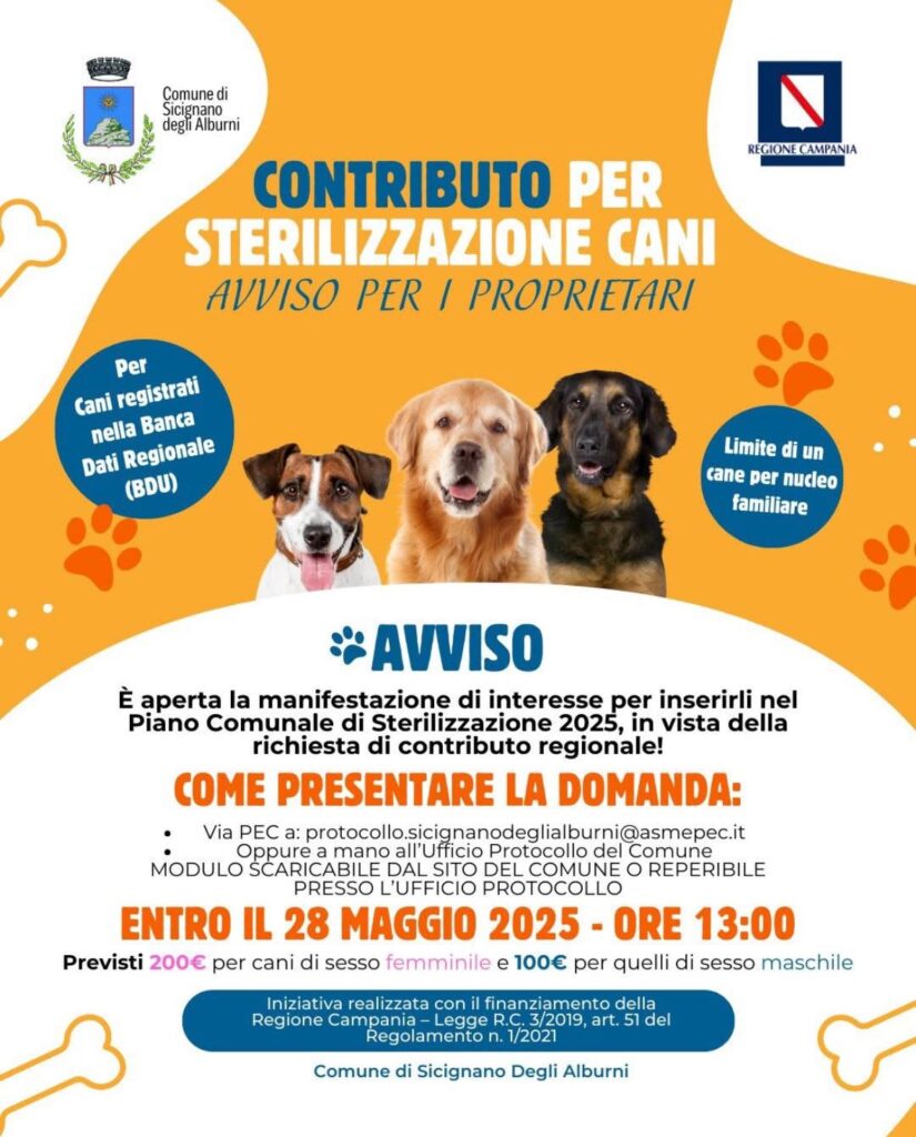 Gesto di grande solidarietà quello lanciato dal Comune di Sicignano degli Alburni. L’amministrazione comunale del piccolo centro salernitano, guidata dal sindaco Giacomo Orco, ha lanciato due iniziative volte ad arginare il fenomeno del randagismo e a migliorare il benessere degli animali, in particolar modo dei cani. Il primo di tali interventi prevede la concessione di un contributo economico ad ogni cittadino che faccia sterilizzare il proprio cane. Il contributo previsto è di 200 euro per i cani di sesso femminile e 100 euro per quelli di sesso maschile. I cani devono essere necessariamente registrati nella Banca Dati Regionale. Il limite è quello di un cane per nucleo familiare. Il modulo per poter chiedere la sterilizzazione dei propri animali è scaricabile dal sito del Comune o reperibile presso l’ufficio protocollo, e presentabile entro il 28 maggio alle ore 13:00.