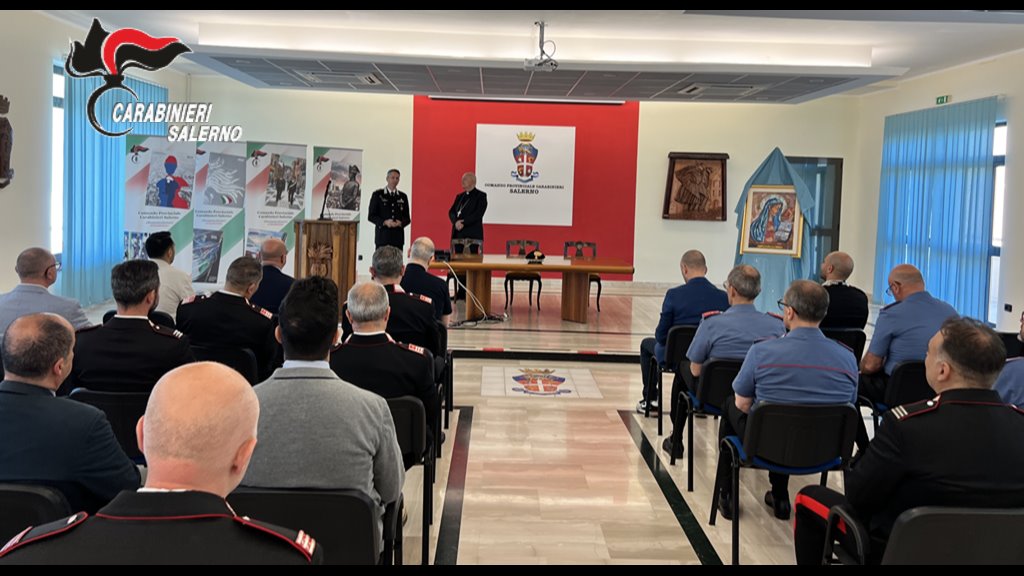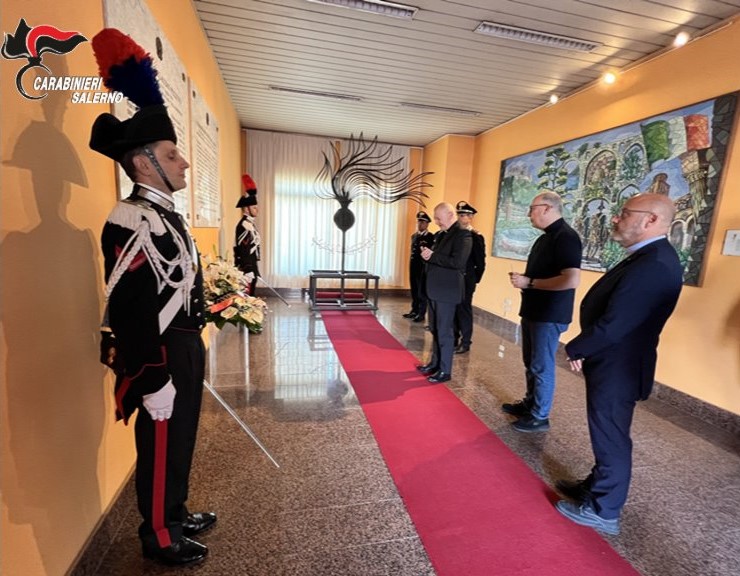 Durante l’incontro, l’Arcivescovo ha benedetto le lastre marmoree poste all’ingresso della caserma, intitolata alla memoria dei Carabinieri Fortunato Arena e Claudio Pezzuto, caduti in servizio a Pontecagnano Faiano nel 1992 durante un conflitto a fuoco con malviventi.