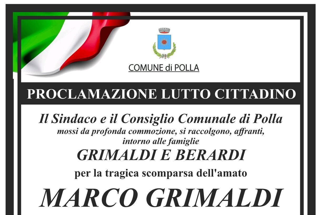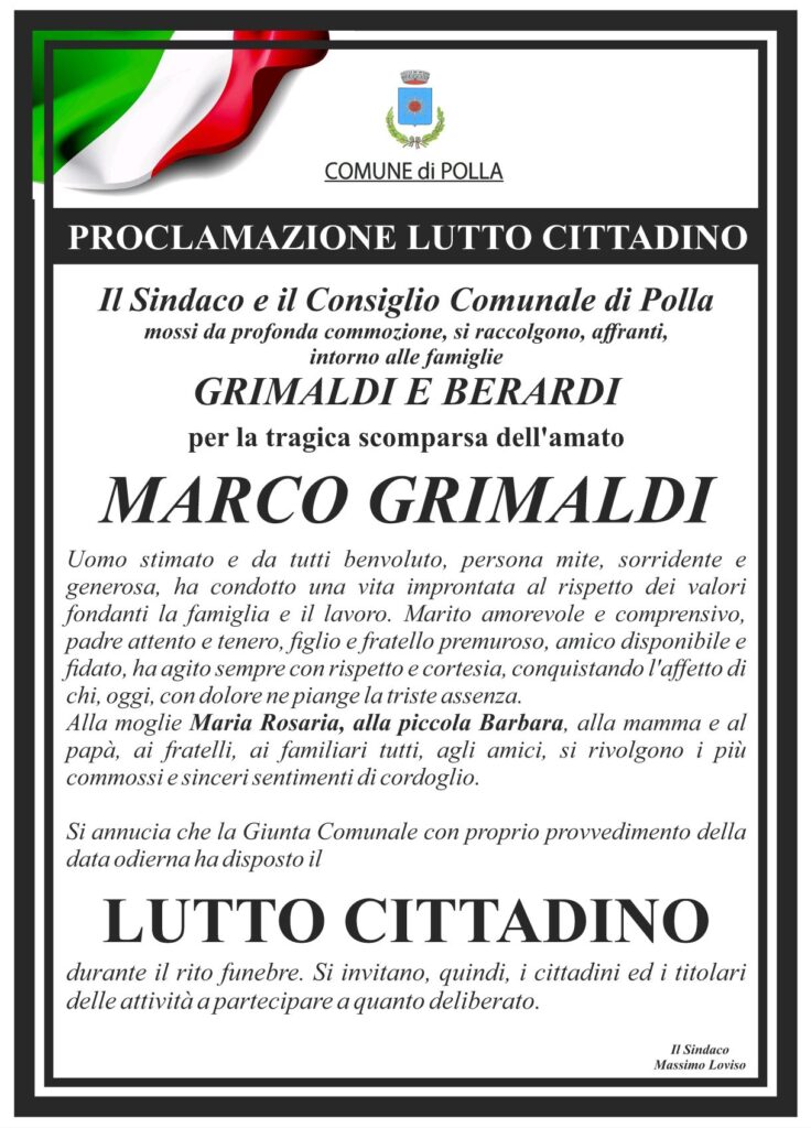 La decisione è stata annunciata ufficialmente attraverso una nota in cui l’Amministrazione comunale esprime cordoglio e affetto nei confronti delle famiglie Grimaldi e Berardi, profondamente colpite dalla perdita di Marco, uomo conosciuto e stimato da tutta la comunità.