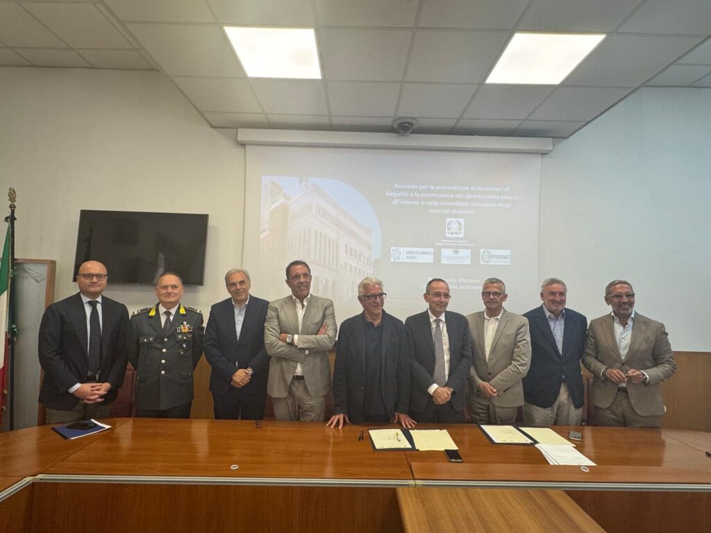 La Prefettura di Salerno rafforza il suo impegno per una movida più sicura e responsabile, attraverso la firma di due protocolli chiave: l’“Accordo per la prevenzione di fenomeni di illegalità e la promozione del divertimento sicuro” e il “Protocollo video-allarme antirapina”. La sottoscrizione è avvenuta questa mattina presso il Palazzo di Governo, alla presenza del Prefetto Francesco Esposito, del Vicepresidente della Camera di Commercio Giuseppe Gallo, dei rappresentanti di Confesercenti e Confcommercio, del Sindaco Vincenzo Napoli e delle principali autorità provinciali di pubblica sicurezza.