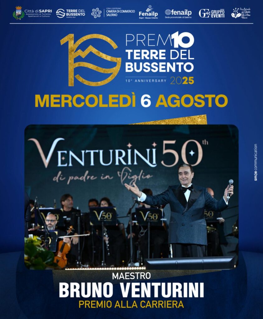 Mezzo secolo di musica e passione. In occasione dei suoi straordinari 50 anni di carriera, il Premio “Terre del Bussento”, che si terrà a Sapri dal 4 al 6 agosto, rende omaggio al Maestro Bruno Venturini, voce inconfondibile della canzone napoletana e ambasciatore della cultura musicale italiana nel mondo. Organizzato dal Comune di Sapri e dall’Associazione Terre del Bussento, con il sostegno della Camera di Commercio di Salerno e il patrocinio della Fenailp provinciale di Salerno, di Fenailp Basso Cilento, di Gruppo Eventi, del Parco Nazionale del Cilento, il premio nasce da un’idea di Matteo Martino, che da anni guida la manifestazione e l’associazione. La direzione artistica è affidata a Nello Pepe, presidente di giuria è Franco Maldonato, mentre Vincenzo Russolillo, del Consorzio Gruppo Eventi, è il produttore esecutivo. Quest’anno ha voluto rendere omaggio a una figura che ha incarnato con coerenza e prestigio il valore della memoria musicale, della lingua e della narrazione popolare. Con la sua voce intensa, capace di restituire con rara sensibilità l’anima della musica partenopea, Venturini ha attraversato il tempo rimanendo sempre fedele a una cifra stilistica colta, popolare e profondamente radicata nella tradizione del Sud. Il maestro sarà premiato nella serata del 6 agosto, nella splendida cornice di Piazza Plebiscito di Sapri.
