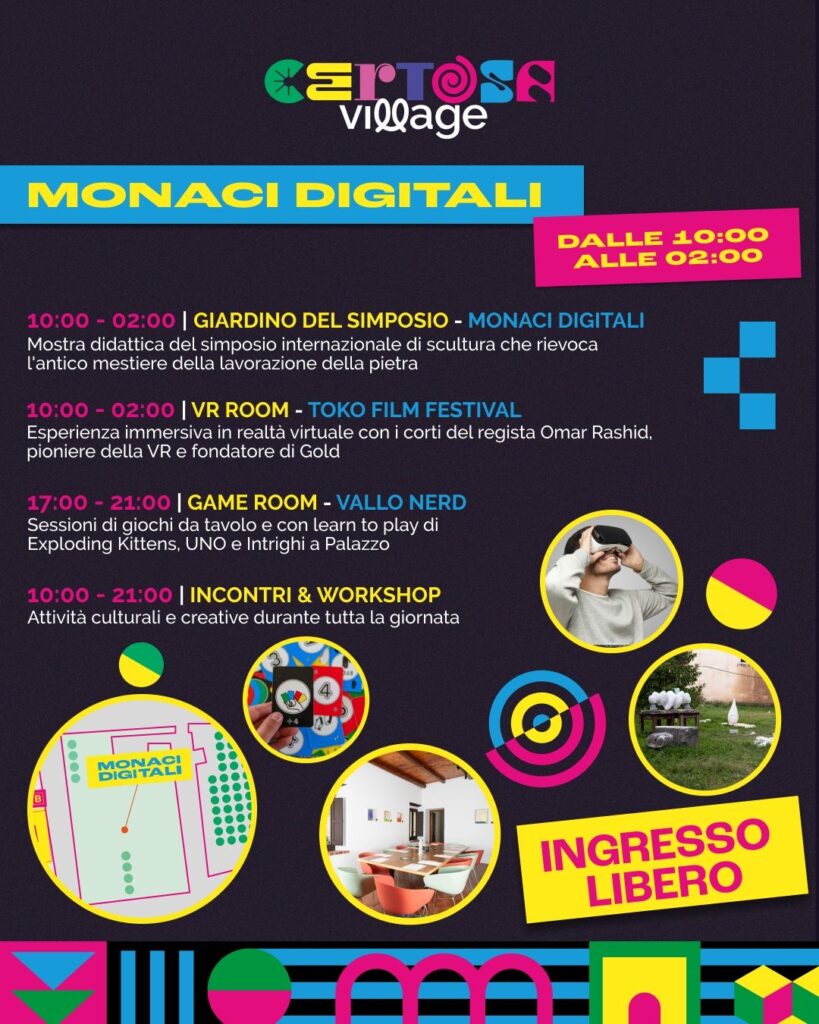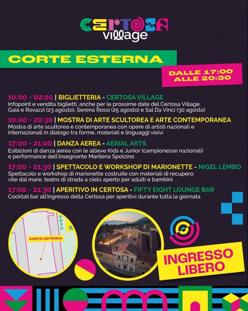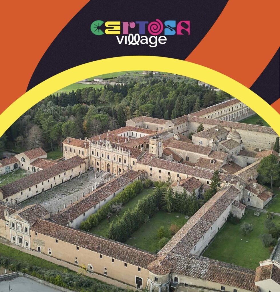 Ma il Village è molto più di un evento serale, è – come raccontano gli organizzatori- «un ecosistema creativo che supera la semplice visione turistica: un invito a godere del sito Unesco in tutte le sue dimensioni, tra passato e presente, spiritualità e intrattenimento; un’intera giornata da vivere, a partire dal pomeriggio». Dalle ore 17:00,infatti, i visitatori, potranno immergersi in un’esperienza culturale e sensoriale a 360 gradi. Passeggiando tra i chiostri e i giardini della corte esterna, sarà possibile rilassarsi e scoprire la bellezza del complesso certosino partecipando a laboratori creativi e attività interattive pensati per tutte le età come la mostra di arte scultorea e arte contemporanea con opere di artisti nazionali e internazionali, l’esibizione di danza aerea con le allieve Kids e Juniors (campionesse nazionali) impreziosita dallaperformance dell’insegnante Marilena Spolzino, e ancora spettacoli e workshop di marionette con materiali di recupero ad opera di Nigel Lembo.