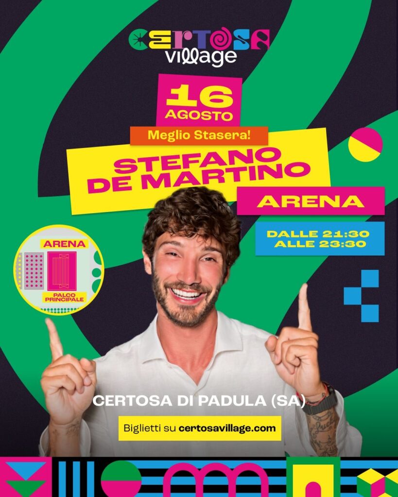 Il conto alla rovescia è finito: sabato 16 agosto finalmente la Certosa di San Lorenzo si trasformerà in un villaggio culturale aperto a tutti, dando il via al primo degli eventi in programma di questa kermesse che fonde arte, spettacolo, gastronomia e bellezza in uno dei luoghi più suggestivi del Sud Italia. A dominare la scena sarà Stefano De Martino, che salirà sul palco alle 21:30 con il suo spettacolo “Meglio Stasera!”, accompagnato dalla Disperata Erotica Band. Tra ironia, musica e riflessioni, lo show promette emozioni, leggerezza e momenti di autentico intrattenimento nel cuore della Certosa più maestosa d’Europa.