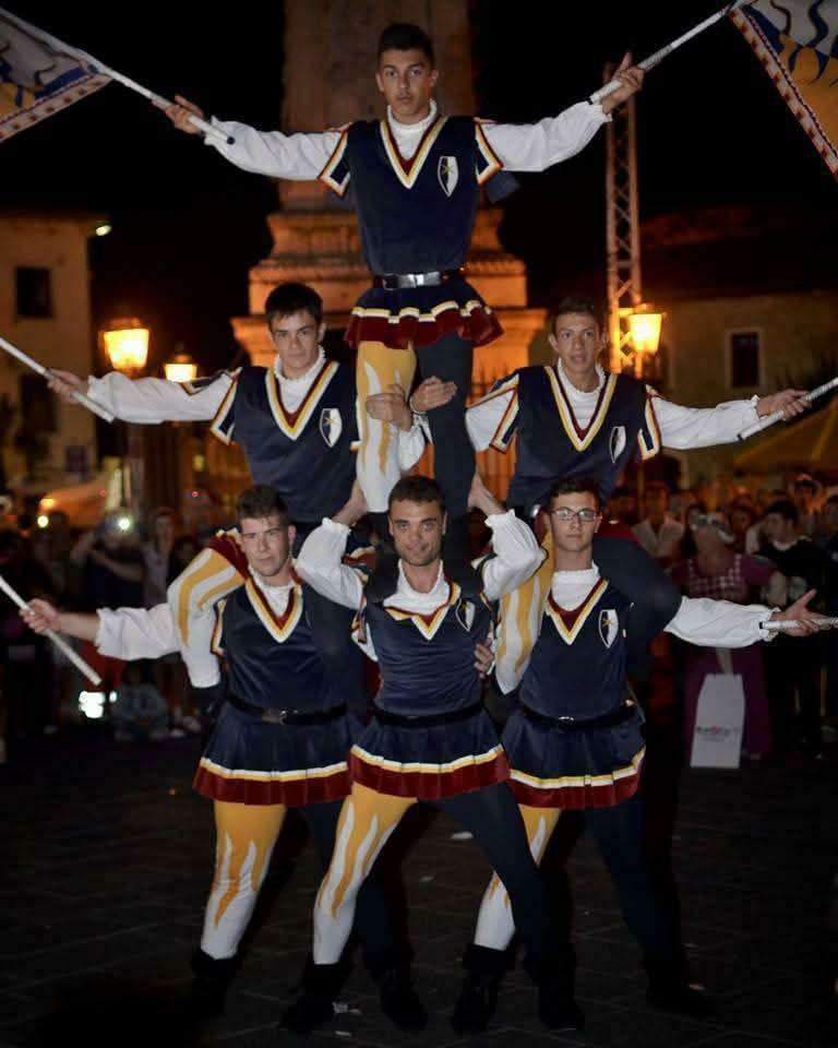Si è conclusa da poco a Teggiano la 30esima edizione de “Alla Tavola della Principessa Costanza”, uno degli appuntamenti più attesi dell’estate campana. A contribuire al successo della manifestazione sono senza dubbio le esibizioni di tamburini, pistonieri, sbandieratori, acrobati, giullari e danzatori. Tra gli spettacoli che hanno riscosso maggior successo tra il pubblico ci sono quelli degli Sbandieratori e Musici dello Stato di Diano che, nella serata conclusiva, hanno deciso di fare un salto nel passato riproponendo uno dei momenti salienti delle loro performance: la piramide umana. Eseguita per l’ultima volta nel 2017, la piramide è stata realizzata con i membri storici del gruppo, tra cui i due fondatori Aurelio Blasi e Marco Pasqua, conquistando gli spettatori nonostante la pioggia battente.