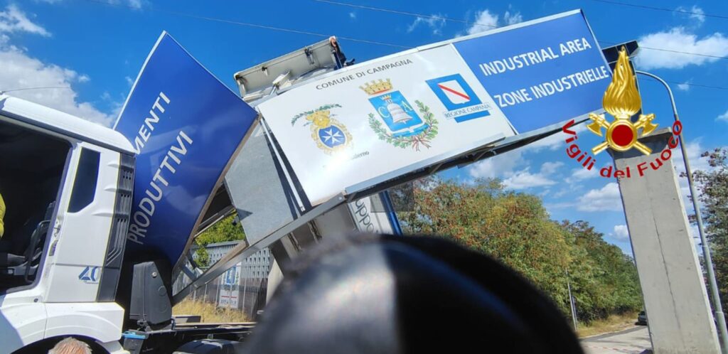 Incidente senza gravi conseguenze nel primo pomeriggio di oggi a Campagna, lungo la Strada Provinciale 38, dove un mezzo pesante in transito ha divelto parte della segnaletica stradale. L’episodio si è verificato in un tratto rettilineo, apparentemente a causa di una distrazione del conducente.