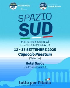 Domani, venerdì 12 settembre, Capaccio-Paestum sarà teatro dell’apertura di “Spazio Sud”, il quinto evento promosso dai gruppi parlamentari di Fratelli d’Italia alla Camera e al Senato, dedicato alle sfide e alle opportunità del Mezzogiorno. Un’intera giornata di confronto tra istituzioni, politica, cultura e mondo economico per rilanciare il ruolo strategico del Sud Italia nello sviluppo nazionale.