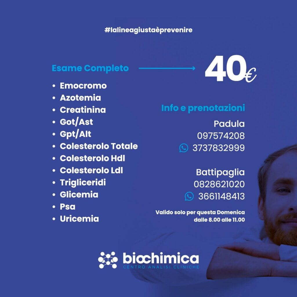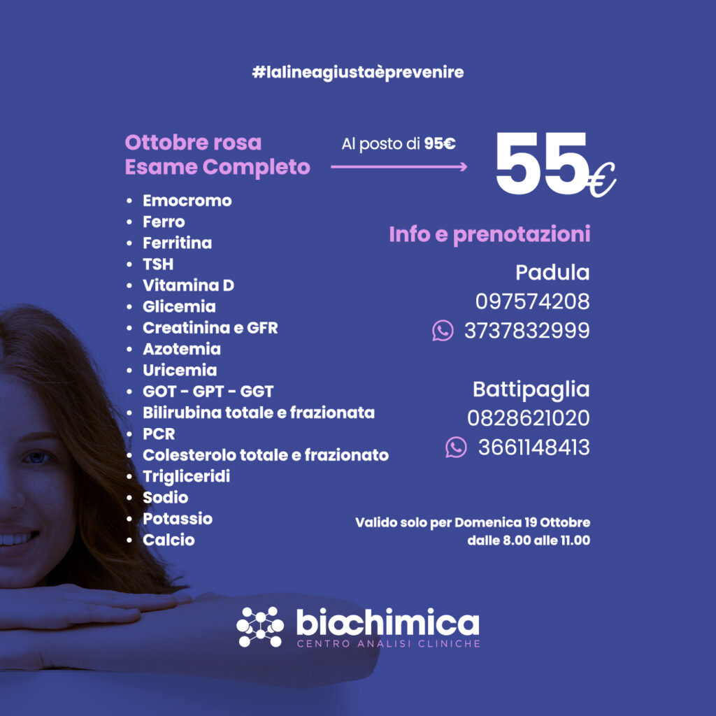 In occasione dell’Ottobre Rosa, i Centri Analisi Cliniche Biochimica aprono eccezionalmente anche di domenica mattina, offrendo check-up completi a prezzi agevolati per incentivare la prevenzione e la diagnosi precoce. L’iniziativa è valida solo per domenica 19 ottobre, dalle 8:00 alle 11:00, presso le sedi di Padula e Battipaglia. Un’opportunità concreta per dedicarsi alla propria salute, anche nei giorni in cui solitamente le strutture restano chiuse.