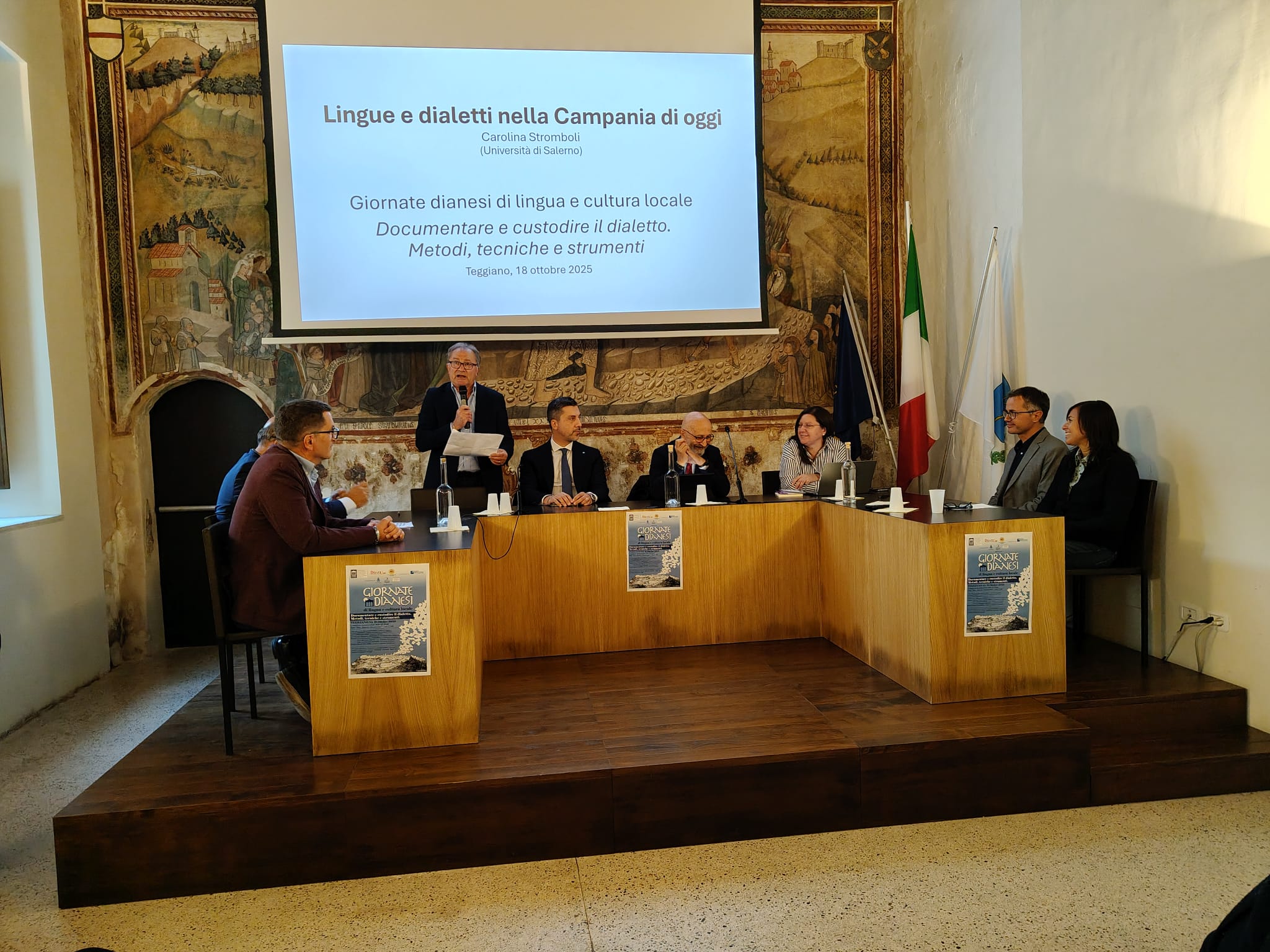Dopo i saluti istituzionali del sindaco di Teggiano, Michele Di Candia, del Direttore generale della Banca Monte Pruno, Cono Federico, e del professore Roberto Manzolillo dell’istituto “Pomponio Leto”, si è entrati nel vivo della giornata di studio dedicata ai metodi, alle tecniche e agli strumenti per documentare e custodire il dialetto. A introdurre i lavori è stato Vincenzo Andriuolo, presidente di Mõre Dianense, seguito dagli interventi della prof.ssa Carolina Stromboli (Università di Salerno), del prof. Giovanni Abete (Università Federico II di Napoli) e della prof.ssa Valentina Retaro (Università di Udine). Al termine dell’incontro, moderato dal direttore editoriale di OndaNews Rocco Colombo, è stato presentato il volume “Campania dialettale. Studi sul repertorio linguistico di oggi” della professoressa Lucia Buccheri (Università di Salerno).