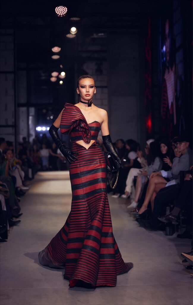 Martino ha presentato dodici look della collezione haute couture “Black Versailles”, nell’ambito dell’evento dedicato all’Alta Moda Italiana, ideato da Stefano Dominella e promosso dall’Ambasciata d’Italia a Tashkent, con il supporto della Click Company. Un’esplosione di volumi, pelle scolpita, tagli audaci e colori magnetici – nero, rosso e oro – ha dominato la passerella, in un’interpretazione barocca e contemporanea della femminilità.