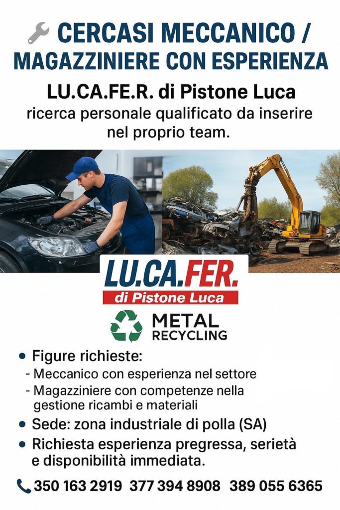 La LU.CA.FE.R. di Pistone Luca, azienda attiva nel settore del metal recycling, ha avviato una nuova selezione per ampliare il proprio organico. L’impresa, con sede nella zona industriale di Polla (SA), è alla ricerca di personale qualificato da inserire immediatamente nel team operativo.