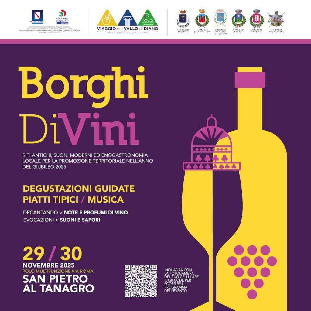 San Pietro al Tanagro si prepara a diventare, nel prossimo fine settimana, uno dei cuori pulsanti del progetto “Viaggio nel Vallo di Diano”, con la tappa autunnale di “Borghi DiVini”, l’evento che il 29 e 30 novembre celebrerà gusto, identità e tradizioni enogastronomiche locali all’insegna della cultura e della convivialità.