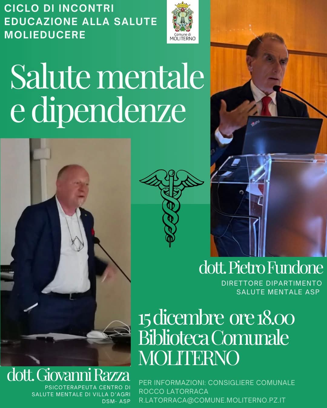 Prosegue il percorso di educazione alla salute promosso dal Comune di Moliterno con il programma #Molieducere, che il 15 dicembre torna con il suo quarto appuntamento, interamente dedicato a un tema di grande attualità: la salute mentale e le dipendenze.All’incontro prenderanno parte il dottor Pietro Fundone, direttore del Dipartimento Salute Mentale dell’ASP, e il dottor Giovanni Razza, psicoterapeuta, due professionisti molto apprezzati che offriranno alla cittadinanza un contributo qualificato per comprendere meglio le sfide e le fragilità che oggi coinvolgono persone di ogni età.In un contesto sociale in cui il disagio psicologico e le dipendenze rappresentano questioni sempre più diffuse, la partecipazione a momenti pubblici di confronto assume un valore fondamentale.