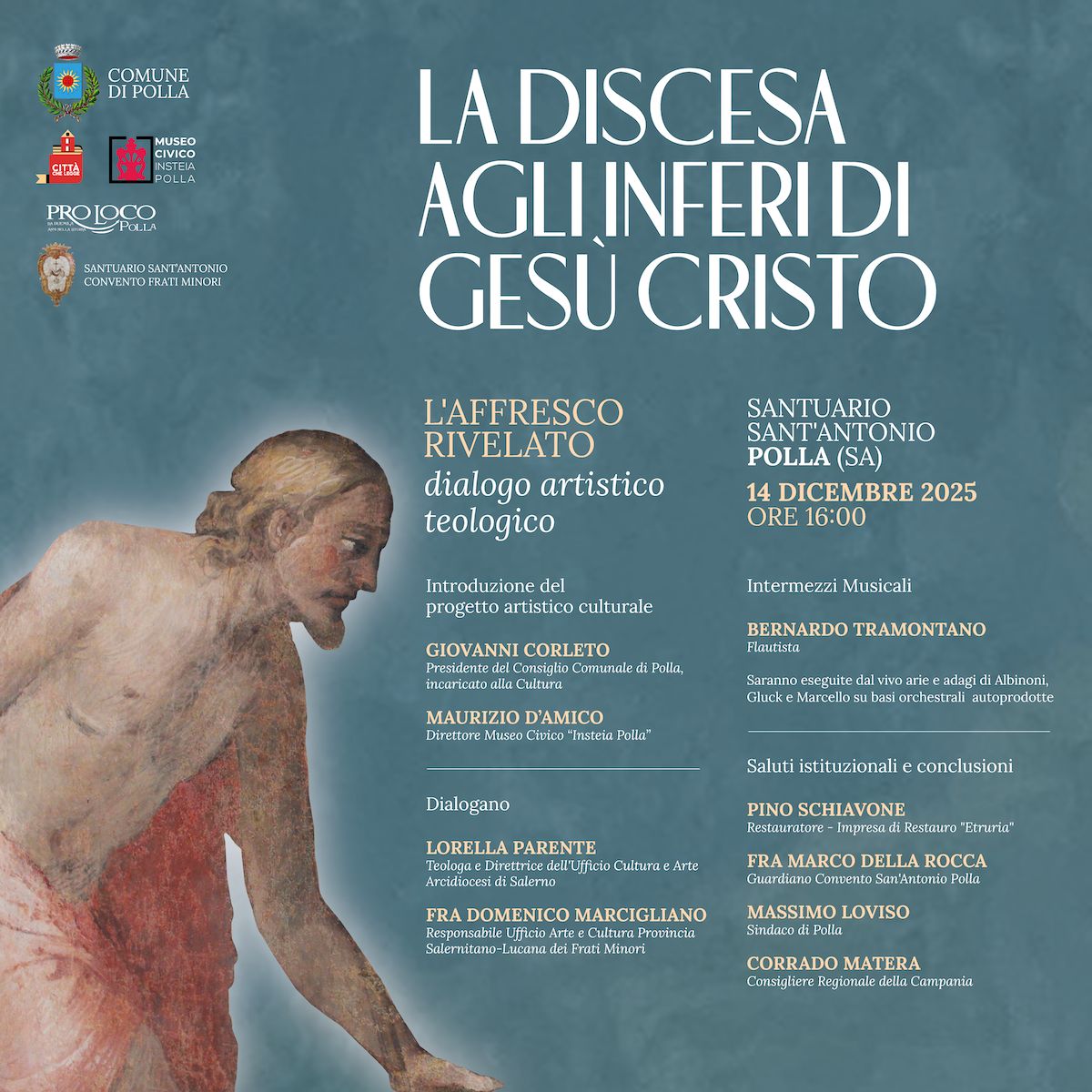 Domenica 14 dicembre 2025, alle ore 16:30, il Santuario di Sant’Antonio di Polla ospiterà un evento culturale di grande rilievo: la presentazione dell’affresco restaurato “La discesa agli inferi”, una delle scene più rappresentative del ciclo pittorico dedicato alla vita di Cristo che arricchisce il complesso religioso. L’iniziativa, promossa dall’amministrazione comunale insieme ai frati francescani, nasce dal desiderio di condividere con la comunità un’opera che, grazie ai lavori di restauro ancora in corso, sta ritrovando la sua luminosità originaria. L’intervento sta riportando alla luce colori e dettagli da tempo nascosti, restituendo agli affreschi il loro valore artistico e teologico.