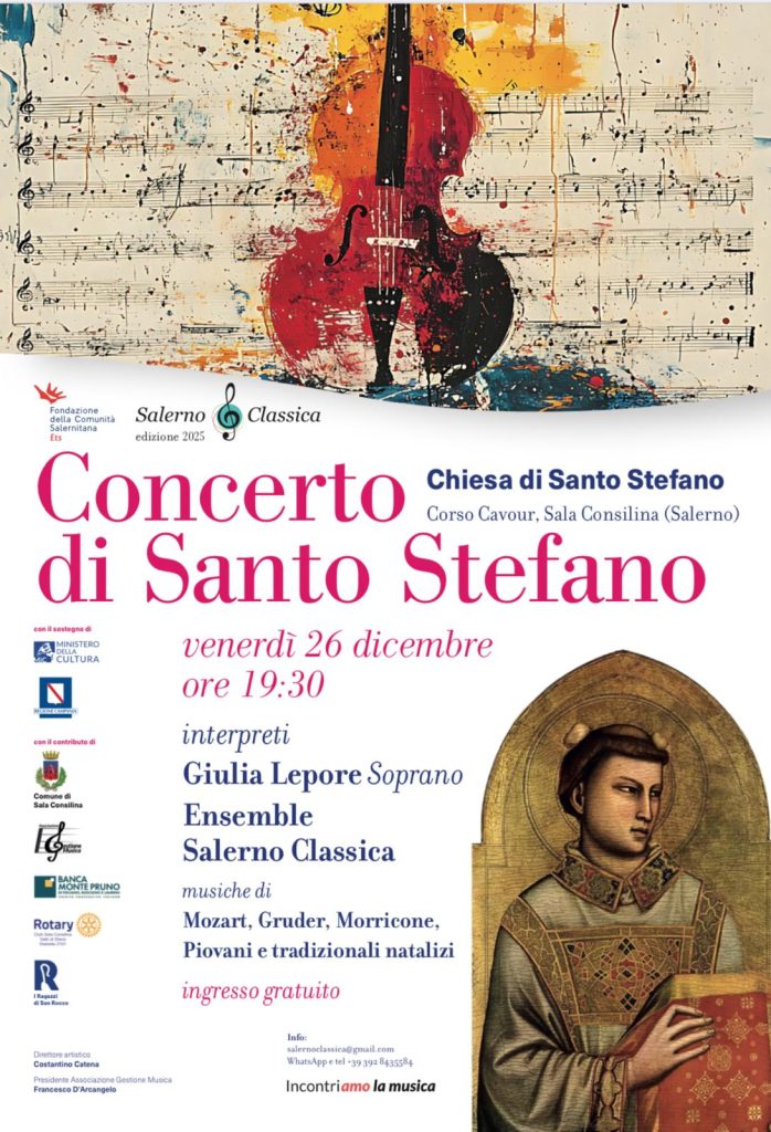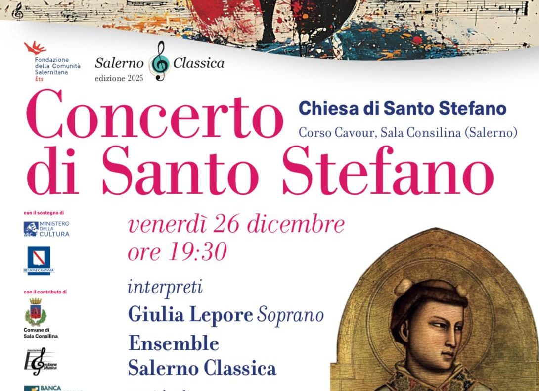 Sala Consilina si prepara a vivere una serata di grande intensità artistica e spirituale con il tradizionale Concerto di Santo Stefano, in programma venerdì 26 dicembre alle ore 19:30 nella suggestiva Chiesa di Santo Stefano, in Corso Cavour. L’ingresso sarà gratuito, nel segno della condivisione e dell’apertura alla comunità.