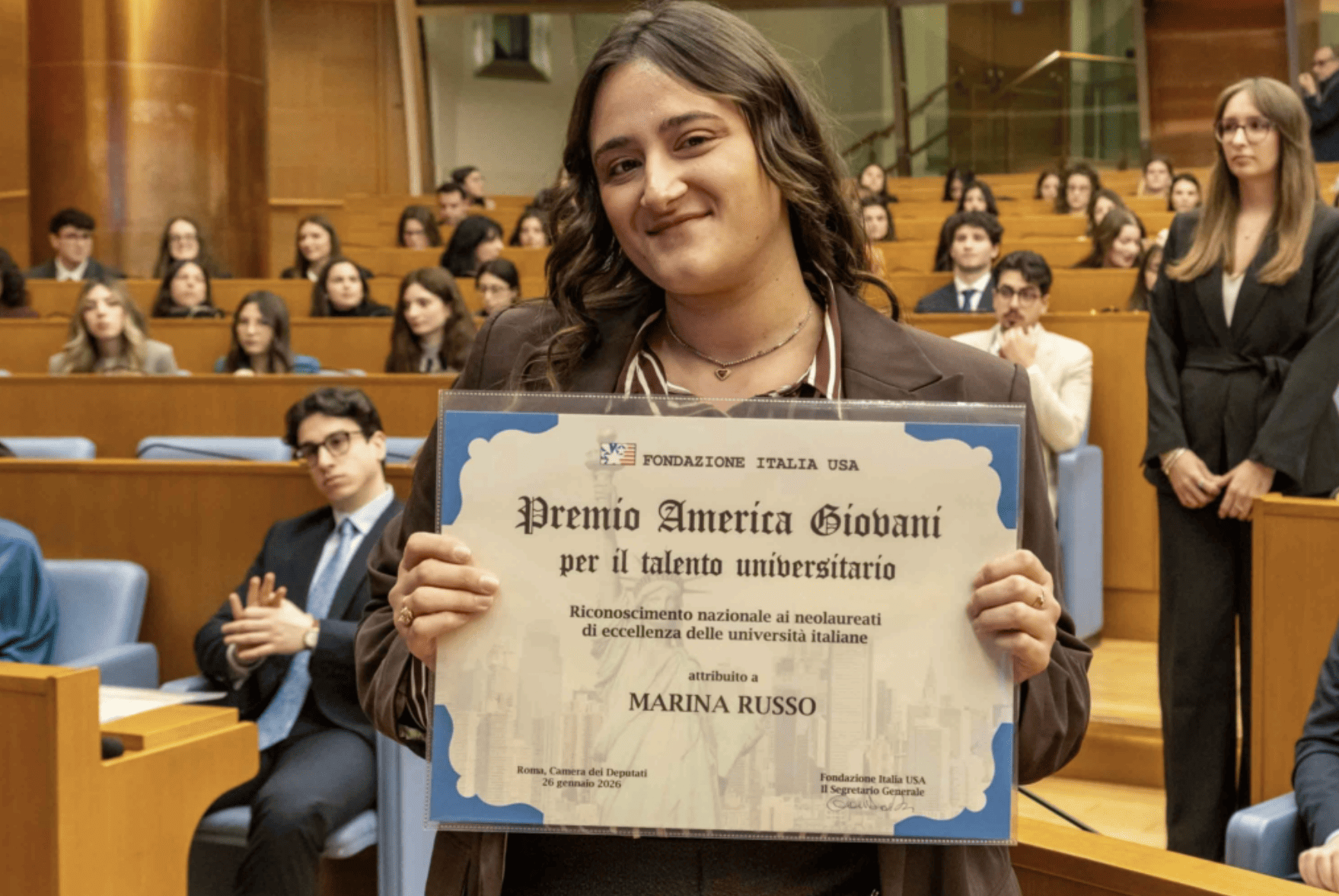 Un altro giovane talento accademico del Vallo di Diano premiato alla Camera dei Deputati nella cerimonia del 26 gennaio. Questa volta a ricevere il premio “America Giovani” istituito dalla fondazione Italia USA per il talento universitario è stata Marina Russo, di Sala Consilina.