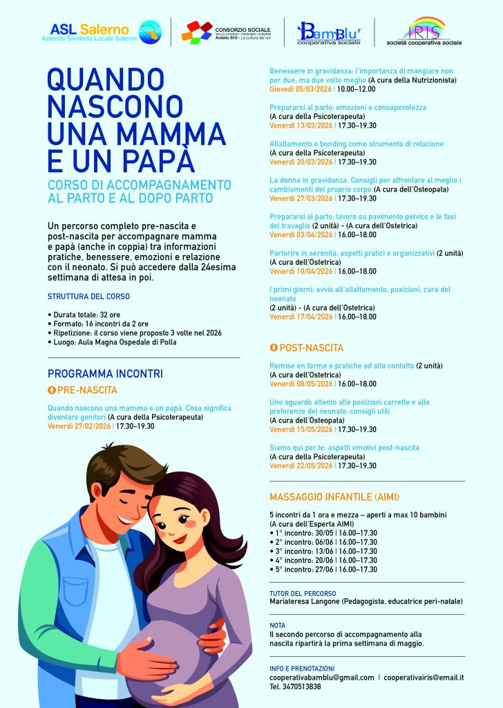 Proseguono le attività dedicate alle famiglie e alla prima infanzia promosse dal Consorzio Sociale Vallo di Diano Tanagro Alburni – Ambito S10 nell’ambito del progetto “Pollicino 0-6”, con l’avvio del corso di accompagnamento alla nascita “Quando nascono una mamma e un papà”, organizzato in partnership con l’ASL Salerno e con la collaborazione delle Cooperative Sociali Iris e Bamblù. L’iniziativa rappresenta un nuovo importante tassello del percorso di sostegno alla genitorialità e alla prenatalità, con l’obiettivo di accompagnare le coppie durante la gravidanza e nei primi mesi di vita del bambino attraverso informazioni scientifiche, supporto emotivo e momenti di confronto con professionisti. Il percorso si svolgerà presso l’Aula Magna dell’Ospedale di Polla e prevede un programma strutturato di 32 ore complessive, articolato in 16 incontri da 2 ore, che sarà riproposto tre volte nel corso del 2026 per garantire la più ampia partecipazione delle famiglie del territorio.