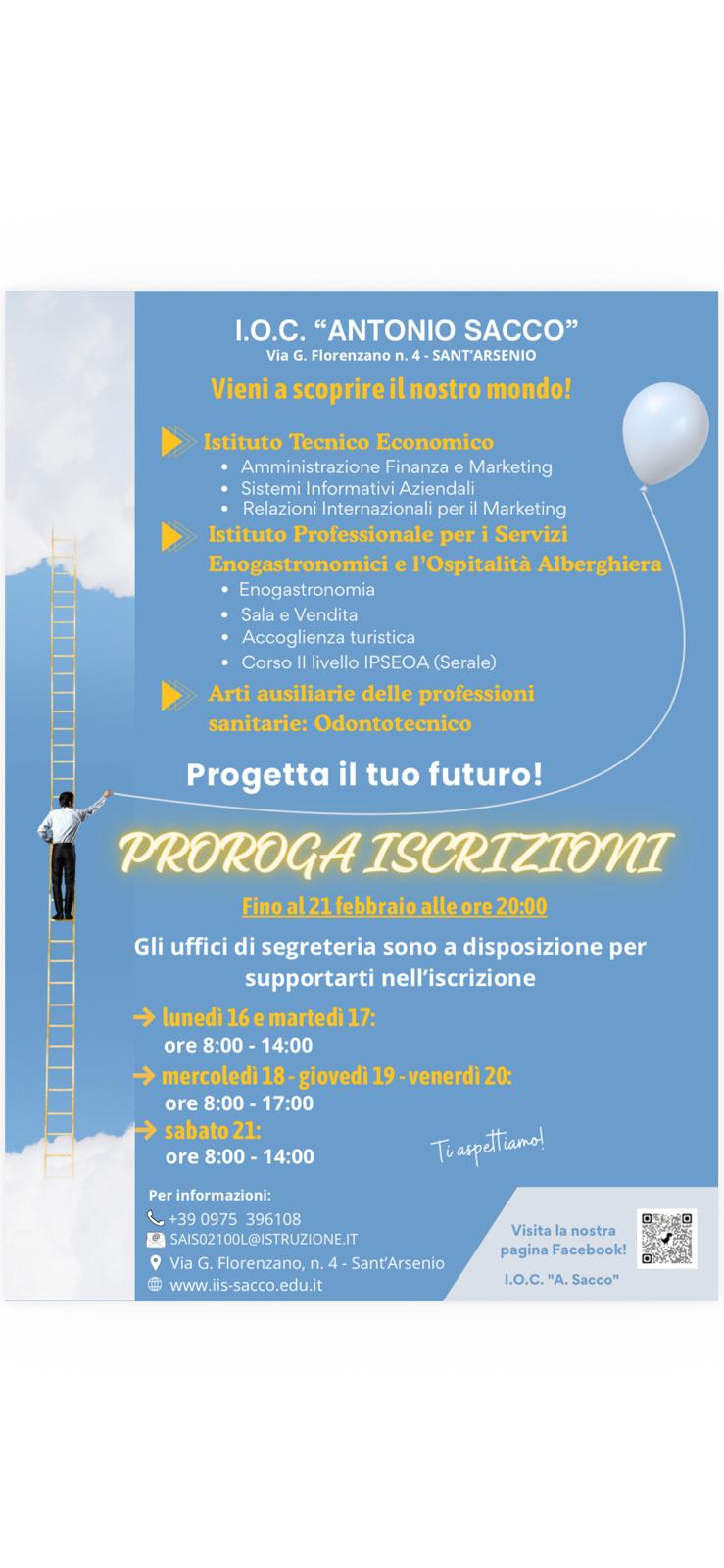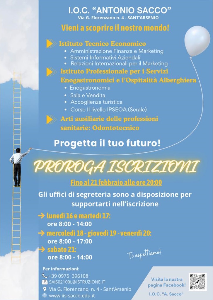 Ultima chiamata per chi vuole scegliere il proprio percorso formativo all’istituto omnicomprensivo “A.Sacco” di Sant’Arsenio: le iscrizioni al prossimo anno scolastico sono state prorogate fino a sabato 21 febbraio alle ore 20:00.